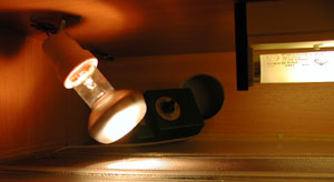 Leuchtstoffröhre und zwei 40-60 Watt Strahlern, die an einen Dimmer